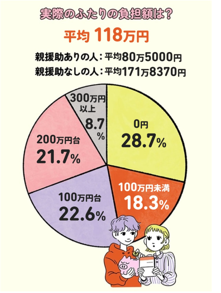 ちなみに以下はゼクシィの調査ですが、30%弱が自己負担額0円で結婚式を叶えていますね。