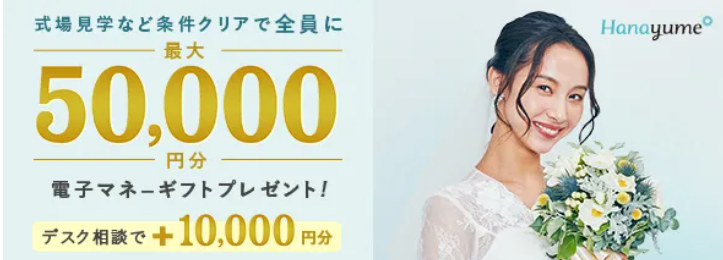 数ある相談カウンター・サイトの中でキャンペーン額・特典ともに優秀でお得に結婚式・ブライダルフェア参加がしたい方はハナユメを使うと費用面では圧倒的な優遇を受けることが出来ます。
