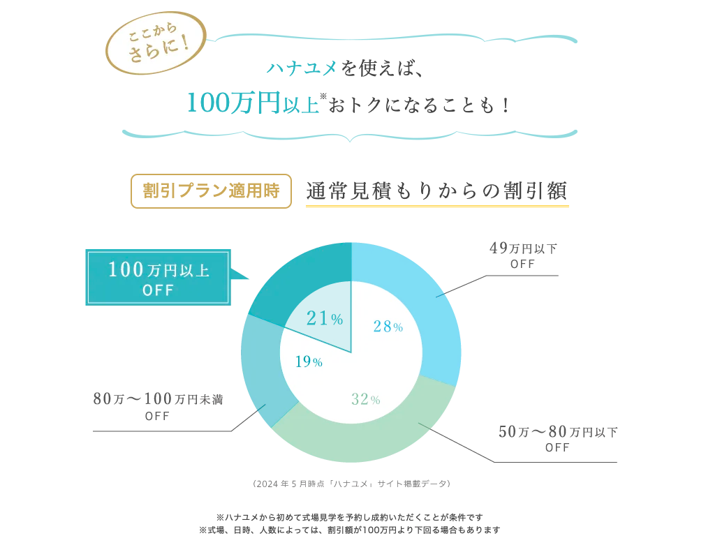 実際にハナユメ公開のデータでも21%以上の方が100万以上お得になっていて、50万以上の割合は7割以上です!