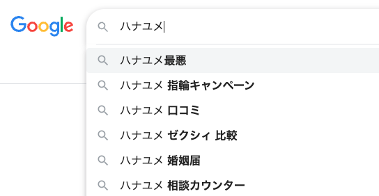 ハナユメってよく聞くけど、悪い評判ってないのかな?と気になった人が検索し、それが増えると「ハナユメ 最悪」というワードがサジェストに表示されるようになり、